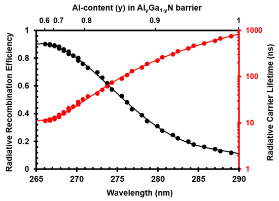 Radiative recombination efficiency (black) and radiative carrier lifetime (red) from a Al0.5Ga0.5N-delta-GaN QW with different barrier Al content; the delta-GaN layer thickness is fixed at 3 Å.