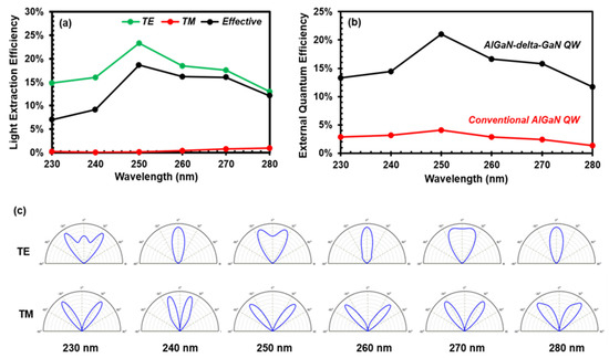 To study the light extraction properties from DUV LEDs, we consider both TE- and TM-polarized emission. Here, the TE-polarized light is defined light which has its electric field component perpendicular to the growth direction (c axis) while the TM-polarized light has an electric field component parallel to the growth direction. Figure 6a plots the polarized light extraction efficiencies for typical LEDs between λ = 230 nm and λ = 280 nm. In general, both TE- and TM-polarized have low values due to the large refractive index difference between the semiconductor and air. However, the TM-polarized photons are even more difficult to extract from the top/bottom of the device because of their natural emission shape inside the active region. As a consequence, a of less than 1% is observed for TM-polarized photons between 230 nm and 280 nm. Although TE-polarized photons have a relatively large , generally between 10% and 20%, the TM-polarized photons generated in the active region still serve to lower the overall . Different values at different wavelengths can be attributed to the light propagation profiles variation caused by the different refractive index for each structure, as well as the absorption difference. Here, we introduce the concept of “effective” , which considers both the extraction efficiency of TE and TM-polarized components, as well as the degree of polarization of the structure at a certain wavelength, in order to study the practical light extraction behavior of DUV LEDs. As shown in Figure 6a, the effective for the conventional AlGaN QW is almost identical to the TE-polarized at longer emission wavelengths (λ = 270 nm to λ = 280 nm) because the majority of the photons generated in the active region are TE-polarized. However, at shorter emission wavelengths, especially around λ ~ 230 nm, more TM-polarized photons are generated, which rarely contribute little to the total light output of the device as they are much more difficult to extract. As a result, only 7% is realized for the conventional AlGaN QW at λ = 230 nm, around half that of the TE-polarized . In contrast, for an AlGaN-delta-GaN QW structure, almost all emission is TE-polarized even at shorter emission wavelengths, enabling high effective extraction efficiencies across the entire DUV range and reducing the need for additional extraction enhancement methods, such as surface roughening or the formation of photonic crystals or nanowires.