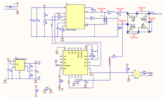 The module controller was designed for easy programming of LED modules through a graphical user interface or with a PC through a console. It was based around SAM3S4B microcontroller (Microchip Technology Inc., Chandler, AZ, USA) and can be powered via USB or from the same power supply as LED modules. It can save several module configurations in its flash memory and, thus, does not have to be configured every time it is powered on. Configurations can have different numbers of connected modules each, and, upon power on an appropriate configuration, will be chosen according to the number of currently connected modules.