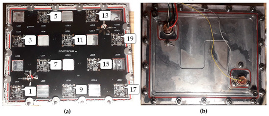 Prototype of the light source with 10 drivers and LEDs. (a) Light source front side, showing LED numbering and positioning used in this manuscript. (b) Light source back side.