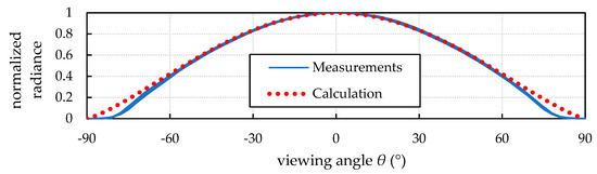 The comparison between measured and calculated irradiance yielded a good fit. The measured average irradiance was 28.6 W/m2 and the calculated one was 25.2 W/m2. This calculation included a 10% loss due to the front glass transmissivity, previously measured by a Lambda 950 spectrometer (PerkinElmer, Waltham, MA, USA). Possible reasons for this underestimation are reflections inside the blackened enclosure, as well as an underestimation of the LED radiance according to the datasheet. Using the upper limit of the bin for the LED power, i.e., 3 W, the calculations yielded a radiance of 28.0 W/m2, which was well within the 10% tolerance the manufacturer keeps on the given irradiance values [32] of the measurement. Further deviations were expected due to differences of the angular radiance profile of the LEDs and its mathematical approximation. While the slight overestimation at high angles by assuming a non-perfect Lambertian angular radiance (Figure 8) had only minor influences on the irradiance profile, it led to an underestimation of Iij calculated from the total LED radiance and, thus, to an underestimation of the calculated total irradiance.