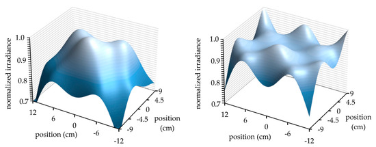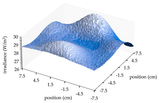 The irradiance measurement in the target plane, described in Section 3.3, is shown in Figure 11. The standard deviation was 1.8% over the analyzed area. The non-uniformity was 5.9%. This value was much smaller than the calculated one given before because of the limited measured area of 15 × 15 cm2.