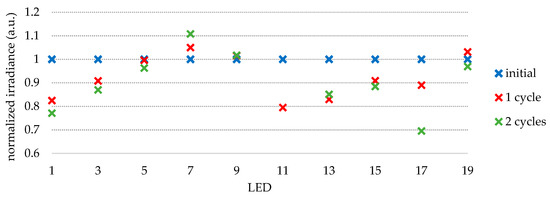 The total LED radiance degrade over time, as can be seen in Figure 12. The average degradation was 7.5% during the first cycle and another 3.2% after the second cycle. It was strongest in LED 1 and LED 17, which were operated at the highest currents, and in LED 11. The corresponding driver of the latter failed during the second cycle. Some drivers failed during the third degradation cycle. Thus, no similar measurement was taken after it. Individual drivers had some issues already in the first two cycles, which were caused by weak soldering joints and were repaired.
