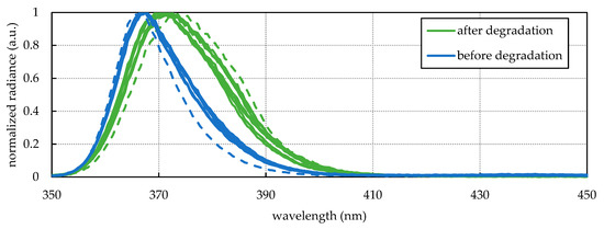 The spectral measurements of the LZ4-04UV00 LEDs are shown in Figure 13. The first set of measurements was taken after several initial tests with the light source, including one resulting in a failure of the sealing, shown in Section 3.4. While nine LEDs could be cleaned and salvaged after this incident, one had to be exchanged. The dashed blue line shows this new LED. The other LEDs already showed signs of early degradation, leading to a comparably higher half-width of the spectrum by emitting more light at higher wavelengths. The peak of all LEDs was at (367 ± 1) nm. The second set of measurements was taken after all three cycles of LED array degradation inside the climatic chamber. Because several drivers failed at this point, the LEDs were powered directly with an EA-PS 3032-10B power supply (EA Elektro-Automatik GmbH & Co. KG, Viersen, Germany). The half-width of the emission peak increased further. The peak wavelength shifted to (371 ± 2) nm. One outlier is shown by the dashed green line, LED 11. Visual inspection revealed a breakage of the cover lens of this LED and discoloration of the area beside the LED died, shown in Figure 14. The lenses cracked also on other LEDs. However, they exhibited no discoloration or stronger degradation.