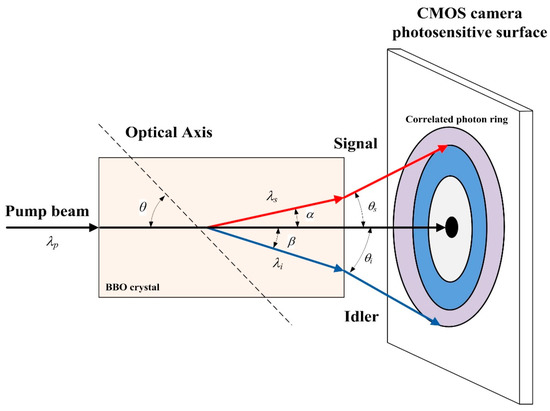 The long-pass filter (with a transmittance of over 95% across the spectrum from 400 nm to 794 nm) and the band-pass filter are represented as LP-F and BP-F, respectively, whose functions are to eliminate any residual radiation at the continuous laser and selecting the wavelength of the correlated photons. Moreover, the non-collinear angular variation and the divergence angular distribution are recorded by means of the imaging device of CMOS camera, whose effective area is 13.312 mm × 13.312 mm and readout mode is chosen 4 × 4, placed in the behind of BP-F. Observe the spectral distribution of correlated photons emitted from the back of BBO crystal, and the results will be presented in Figure 6. It can be found that the signal and idler wavelength of 472 nm and 610 nm are a pair of correlated photons. It is observed that the same ring images appear as the theoretical analysis, in which the spot in each central same area is composed by 266 nm pump not eliminated completely. Although the detection sensitivity of CMOS camera in 400 nm to 794 nm is at least 6 times higher than 266 nm, however, the correlated number is 8 orders of magnitude lower than the pump, the ring cannot be seen without the filters. The results of the theoretical calculations, experimental measurements, and detailed explanations will be developed in the next section.