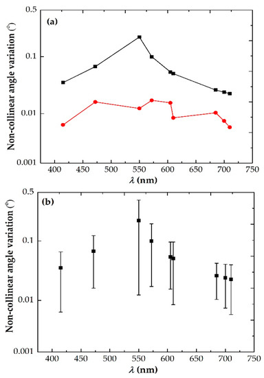 According to theoretical analysis, the correlated photon ring width is related to the non-collinear angular variation, that is, the ring width at different wavelengths is different, and the corresponding non-collinear angular variation is also different. In this section, first using the Equation (12) to calculate the 415 nm, 472 nm, 550 nm, 572 nm, 605 nm, 610 nm, 685 nm, 700 nm, and 710 nm, a total of nine wavelengths corresponding non-collinear angular variation, we find that the theoretical results have a floating range. Then, the ring profile measured by CMOS camera is processed, and the width values can be obtained with the image processing technology, finally converted into the non-collinear angular variation behind crystal (not exuded). Figure 7a shows the theoretical simulations and experimental measurements of the non-collinear angular variation at different correlated photon wavelengths. The black and red curves represent the theoretical values and the measured values of non-collinear angular variation, respectively. Figure 7b illustrates the error bars of the experimental data. It can be observed that the measured values are less than the theoretical simulation, which is the result of the theoretical research under the premise of the largest phase mismatch. Also, it provides reference and guidance for predicting the maximum width and position of correlated photon rings. The non-collinear angular variations of 472 nm, 550 nm and 572 nm are simulated theoretically, higher than the other wavelengths, and the experimental results are consistent with the theory. Meanwhile, with the decrease of signal wavelength and the increase of idler wavelength, the difference between the theoretical and measured values of the non-collinear angular variation decreases. At the wavelengths of 685 nm and 550 nm, the difference between theory and measured data are minimum 0.0168° and maximum 0.1906°, respectively. The reason is that the closer the non-collinear angle is to the degenerate wavelength, the greater the influence of the experimental conditions such as phase-matching angle, pump incident angle, and diameter.