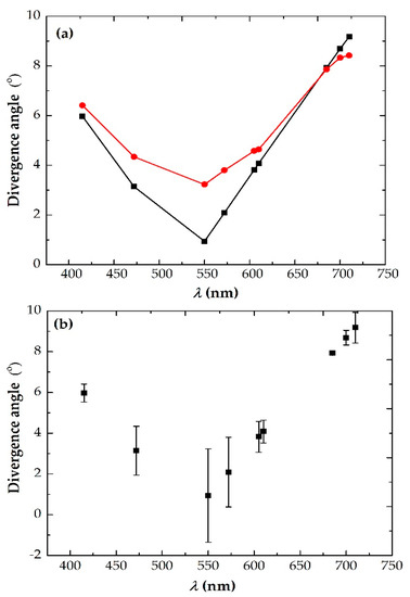(a) Theoretical simulation and experimental measurement of the divergence angular spectrum at different photon wavelengths. The black curve represents the theoretical values, and the red curve is the experimental results. (b) The error bars of the experimental data of the divergence angle.