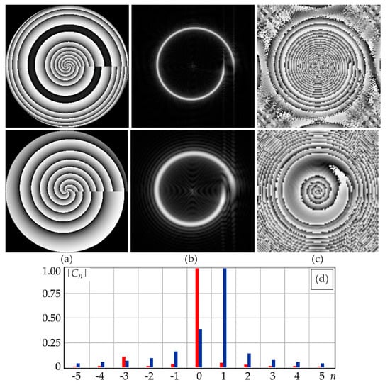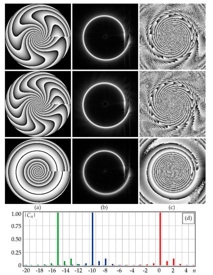 As can be seen (the first column in Table 1), the phase structure of the optical element has a spiral topology similar to the structures considered in [18,24]. It should be noted that the presence of a spiral structure in an optical element, which can be realized also by arrays of metallic nanoparticles [48,49], leads to the appearance of the angular momentum. In contrast to the classical vortex phase singularity, which ensures the formation of the orbital angular momentum (OAM) of the integer order (there is only one angular harmonic) [25,26], the spiral structure leads to the appearance of a set or a sequence of angular harmonics [24,48].