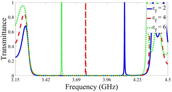 First, the transmittance of the proposed device has been studied, as shown in Figure 2. Here, the defect layer is tested for permittivity from up to with a thickness The transmittance shows a PBG between and with a width equivalent to . When the defect permittivity equals , the defect peak exists at while it shifts to , and , as the permittivity changes to , and , respectively. Table 1 summarises the parameters of the defect peak as the defect permittivity changes. The quality factor is a dimensionless quantity and can be obtained from the following equations: