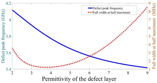 Figure 4 presents a more quantitive analysis of the peak properties. The defect peak frequency decreases with raising the defect layer permittivity, as shown in Figure 4. The full width at half maximum is shrinking with rasing defect permittivity until it reaches at defect layer permittivity equals ; then, it starts raising again as the value of defect layer permittivity increases. For example, when the defect permittivity equals 2, the defect peak appears at with a full width at half maximum equivalent to Meanwhile, it reaches with a full width at half maximum equals as the defect layer permittivity equivalent to 9. The frequency of the defect peak in can be fitted with the defect layer permittivity as the following: