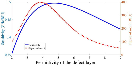 The sensitivity and the figure of merit of the proposed structure as the defect permittivity increases.