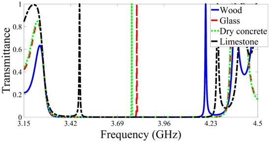 Then, we analyzed the proposed device for everyday materials, as shown in Figure 6. The refractive indices of the selected materials are listed in Table 2 [39]. For materials with permittivity between 3 and 6, such as dry concrete and glass, the defect peaks for these materials appear around the center of the PBG with relatively high sensitivity and figure of merit, as listed in Table 2. On the other hand, the defect peaks of the materials with permittivity greater than 6 or less than 2 appear in the edges of the PBG. For example, the defect peaks of wood and limestone appear at , and respectively. Moreover, these materials’ sensitivity is relatively low compared to materials such as dry concrete or glass.