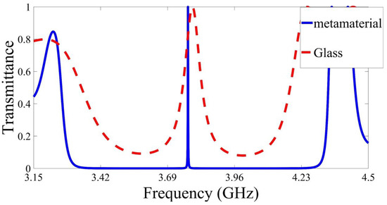 Transimmtace of the proposed structure with a unit cell composed of metamaterial/silicon and glass/silicon.