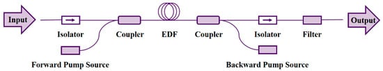 Based on the EDF, combining pump light sources and other passive optical structures, an EDFA is packaged for signal amplification in optical systems [23]. The basic structure of EDFA is shown in Figure 2, containing the EDF, pump source laser, isolator, coupler and filter. The isolator is used to transmit signals in one direction only [24]. The coupler is used to combine the injected pump lights and signal lights. The filter is used to remove the generated noise. The forward pumping scheme, backward pumping scheme and bidirectional pumping scheme are all feasible structures for EDFAs. For a more general consideration, a bidirectional pumping structure is shown here.