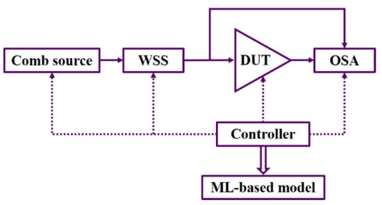 In these modeling processes, data collection is the key. Datasets of EDFA gain spectra (or output power spectra) under various input conditions are required. Actually, for the commonly used C-band EDFAs, dozens of channels are utilized, so the configuration of the input signal can be very diverse, which leads to a complex feature space. Furthermore, the EDFA gain performance under different inputs varies case by case, so huge datasets containing various situations are needed to cover the complex features in modeling. In current studies, such huge datasets are usually automatically collected in the experimental system, which is a rather time-consuming process. A typical experimental setup is shown in Figure 3. Optical signals are generated by a comb source or an ASE noise source, which is filtered by a wavelength selective switch (WSS) to select the active channels and finetune the shape of the channel power spectrum. The filtered optical signal is used as the input of the device under test (DUT), whose input and output power spectra are captured by optical channel monitors (OCM). A controller is used to control all the devices and automate the data collecting process. After the experimental data collection, the data samples are fed into ML-based training schemes. Several ML-based schemes for training the EDFA gain model have been proposed.