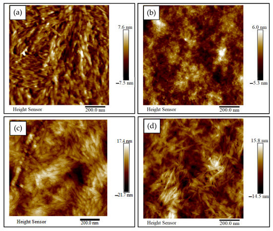 AFM topographic images in 2D of (a) NCC, (b) PEDOT, (c) NCC/PEDOT (before), and (d) NCC/PEDOT (after) thin films.