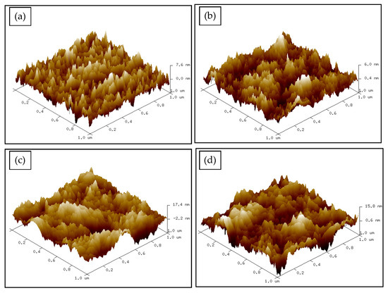 The morphology features of the spin-coated NCC, PEDOT, and NCC/PEDOT thin films were identified by atomic force microscope (AFM), and it was carried out in tapping mode. In this study, a scan size was fixed (1 µm × 1 µm), for the imaging of the topographical difference in the thin films. From AFM images, the root mean square (RMS) roughness was obtained, which indicates the relative roughness and the standard deviation of the surface height. Figure 3a–c and Figure 4a–c show the AFM images of the NCC, PEDOT, and NCC/PEDOT thin film, respectively. Then, the AFM results of NCC/PEDOT thin film after being in contact with the Hg2+ solution are depicted in Figure 3d and Figure 4d.