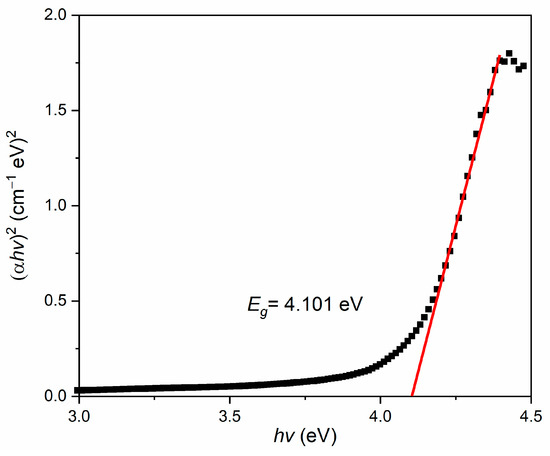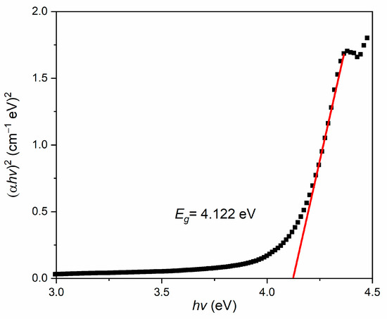 where α is the absorption coefficient, hv is the energy of a photon, k is a proportionality constant, and Eg is the optical band gap. Then, an intersection from extrapolation of the plot of (αhv)2 against hv will determine the optical energy band gap of the NCC, PEDOT, and NCC/PEDOT thin film, as illustrated in Figure 6, Figure 7 and Figure 8, respectively [72]. Thus, the achieved values of the optical band gap, Eg, were obtained from the extrapolation of the straight plot on the x-axis from Tauc’s relation.