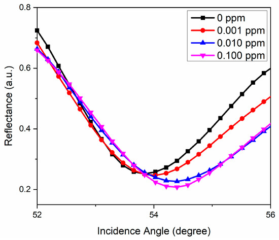 The plasmonic sensing of the NCC/PEDOT thin film was investigated and tested with deionized water and various concentrations of analyte (0.001 ppm, 0.01 ppm, and 0.1 ppm of Hg2+) via SPR. When the analyte was injected separately into the cell, the graph of reflectance against the incidence angle for each concentration was recorded and compared with deionized water (0 ppm) as the baseline. This SPR-based plasmonic sensor works by monitoring the shift in the resonance angle, which can be influenced by any changes in the refractive index of the sensing layer attached to the gold thin film [73,74,75]. Figure 9 reveals a clear trend of an increase in the resonance angle shift of the NCC/PEDOT thin film in contact with 0 ppm to 0.1 ppm of mercury ion. This sensor is very sensitive to any changes near the metal surface. The attachment of metal ions on the layer of the NCC/PEDOT thin film appears to have contributed to the changes in the refractive index as well as the resonance angle [76,77,78,79]. The SPR signals were shifted to a higher incidence angle from 54.0099°, 54.3782°, and 54.4086° for 0.001 ppm, 0.01 ppm, and 0.1 ppm respectively. Because there is an interaction between the NCC/PEDOT thin film and the analyte, the existence of more active sites on the surface of the thin film may lead more mercury ions to occupy and access these sites [80].