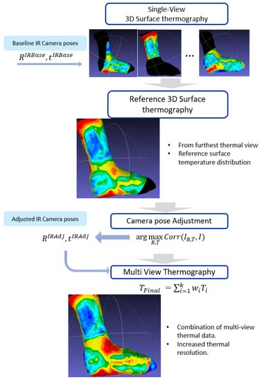 The creation of a multi-view 3D surface thermography consists of three steps: First, a selection of a reference thermal mapping. Then, an adjustment of the camera poses according to the reference mapping; finally, a combination of the thermal mapping information from different views. The result is a multi-view thermal mapping of the 3D surface, which has a higher resolution and can cover a larger area compared to single-view thermal mapping. The workflow is presented in Figure 2.