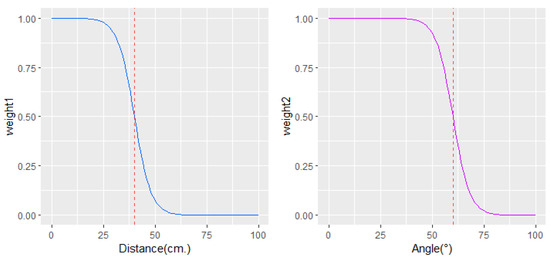 Thus, in the process of temperature fusion from different views that we propose, higher priority is given to thermal information obtained at a distance of up to 40 cm and a viewing angle of less than 60° between the camera and the skin. The weights are inversely associated to distance and angle via inverse logistic function to set high weights on distances before 40 cm and angles below 60°. The weighting functions used to prioritize information obtained from different angles and distances are shown in Figure 3. Weighted averaging to combine the information of k thermal images from different perspectives is performed at each point in the 3D point cloud as follows: