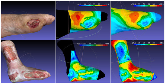 The proposed methodology was successfully applied to wound images from six different patients. Figure 5 illustrates the multiview thermal models in two cases of wounds: one located in a curved area and the other with multiple wounds in the same area. By using a multiview thermography with the proposed methodology, a more extensive area of the skin can be covered with thermal information, making it possible to obtain thermal metrics of the wound bed and periwound.