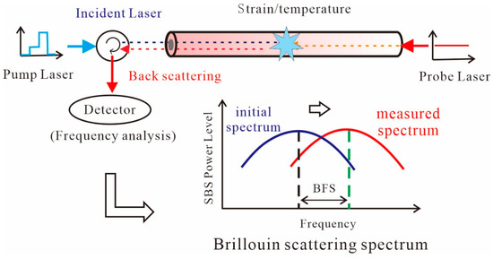 When light travels through an optical fibre, a small fraction of the light is back scattered due to perturbation, and the scattered light can be divided into three types: Rayleigh scattering, Raman scattering, and Brillouin scattering [31]. BOTDA technology is based on stimulated Brillouin scattering. As shown in Figure 1, one laser beam, called the pump laser, and another laser beam, called the continuous wave probe laser, are injected into an optical fibre core from either end. An acoustic wave will be produced when these two laser beams interact in a specific region of the fibre through a phenomenon called electrostriction. At the same time, the interaction of two light beams leads to a power transfer. The continuous wave probe light will undergo local amplification when the frequency shift between the two light is within the Brillouin gain spectrum of the fibre [32]. The Brillion gain spectrum, as a function of the strain or temperature, can be measured by scanning the frequency of the continuous probe laser. By continuously changing the frequency of the two injected laser beams and analysing the detected backscattering light at the receiving end, the strain or temperature can be expressed as follows: