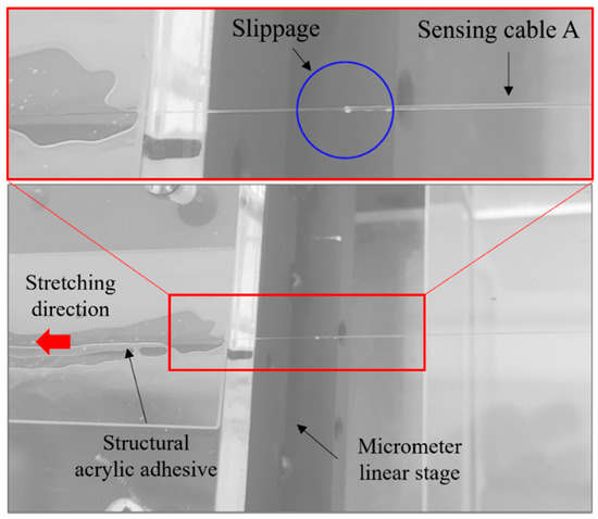 In contrast to the tensile load test method, the improved calibration method does not assume null strain at the ends of the bonding length. In fact, slippage or strain transfer loss at the end of the fixation section is difficult to eliminate in the calibration process [3]. An imperceptible error can lead to an underestimation of the strain coefficient, especially for novices. In our preliminary test, significant slippage occurred between the sensing cable and the cured adhesive (see Figure 11). The obtained strain coefficient was 0.0419 MHz/με, which is much smaller than the true value. In this paper, the difference in the strain coefficients obtained by the improved calibration method and the tensile load test method is no more than 2%. This is mainly due to the use of a suitable glue and sufficiently large calibration setup in the experiment. The error induced by the uncertainly in the initial length was greatly reduced. Furthermore, the sensing cables used in this study are very thin, which contributes to a reduction in error due to strain transfer loss at the fixing points. In short, the improved strain calibration method proposed in this study can be used to solve the above problems and make the calibration results more accurate by only slightly improving the tensile load test setup.