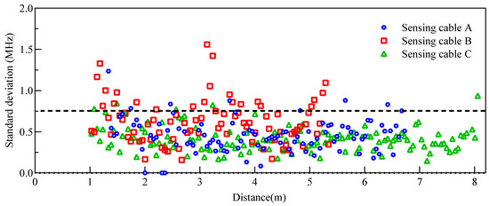 The strain measurement is subject to a measurement repeatability error, which is highly related to the measurement accuracy of the BOTDA interrogator. Normally, accuracy is referred to the closeness of the measurements to a specific value [35]. In this paper, the performance of the BOTDA interrogator is defined as the statistical variance in a repeat measurement of the BFS along the optical fibre. The BFS readings were taken by using the same interrogator, configuration, and operator in a very short time. All three sensing cables were measured five times at a free strain state. The spatial variation of the BFS along the optical fibre was obtained by calculating the standard deviation for the multiple readings. As shown in Figure 5, the standard deviations in BFS are always below 0.75 MHz for sensing cables A and C at the mid-section. The standard deviation in BFS for sensing cable B spans a wide range from 0 MHz to 1.65 MHz. This may be related to the fact that sensing cable B exists in a ring-wound state during the test. The strain measurement accuracy provided by the equipment manufacturer is ±15 με (equal to approximately ±0.75 MHz). Therefore, it can be determined that the strain measurement accuracy of the BOTDA interrogator is consistent with the factors reported by the manufacturer.