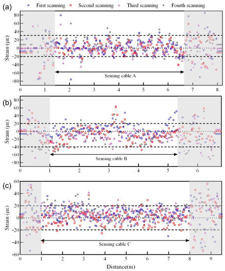 To further investigate the effect of the strain measurement accuracy for small strain measurements, the first reading of the BFS was treated as a baseline, and the other four readings were treated as observed values. The BFS difference (ΔVB) is defined as the difference between the baseline and observed values. To facilitate understanding, the difference in the BFS was converted to a strain with a strain coefficient of 0.05 MHz/με. Figure 6 shows the results obtained. The strain errors mainly ranged within −20~+30 με, −40~+30 με, and −20~+20 με for sensing cables A, B, and C, respectively. This means that the effect of the strain measurement error needs to be considered when measuring strain values that are less than the strain errors. Only when the measured strain is much larger than the strain errors can the strain measurement error be ignored.