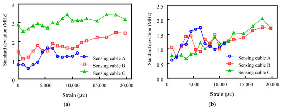 Ideally, the BFS should remain constant within the elongated section of the sensing cable. However, in practice, unexpected BFS fluctuations are often observed, and the influence on the strain coefficient calibration is not assessed. The standard deviations for the BFS of the sensing cables are shown in Figure 8a. With increasing strain, the standard deviations for the BFS for all three sensing cables slightly increase. Especially for sensing cable B, the standard deviation changes from 1.089 MHz to 2.486 MHz. Sensing cable A has the lowest standard deviation between 0.569 MHz and 1.653 MHz, and sensing cable C has the highest standard deviation between 2.543 MHz and 3.431 MHz. These values are larger than the BOTDA interrogator-induced errors. Therefore, the BFS fluctuation may be related to nonuniform bonding of the coatings or buffering.