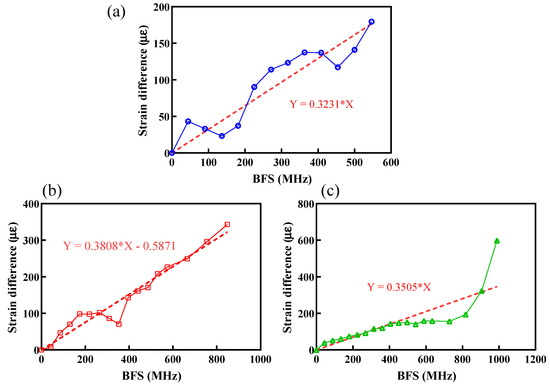 where U2 is the relative uncertainty of the strain coefficient induced by the uncertainty of the change in length of the strained fibre, εd is the strain difference, and C12 is set to 0.05 MHz/με. Since there is a positive correlation between the strain difference and BFS, U2 is equal to the slope in Figure 5. Therefore, the relative uncertainties for the strain coefficient induced by strain transfer loss for sensing cables A, B, and C are 0.3231 με/MHz, 0.3808 με/MHz, and 0.3505 με/MHz, respectively. The U2 values for sensing cables A, B, and C can be converted into units of MHz/με by using a coefficient of 0.05 MHz/με to give 8.074 × 10−4 MHz/με, 9.52 × 10−4 MHz/με, and 8.763 × 10−4 MHz/με, respectively.