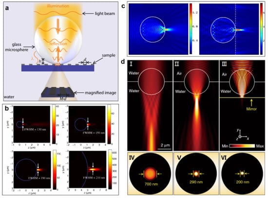 - Sundaram, V.M.; Wen, S.B. Analysis of deep sub-micron resolution in microsphere based imaging. Appl. Phys. Lett. 2014, 105, 204102. [Google Scholar] [CrossRef]