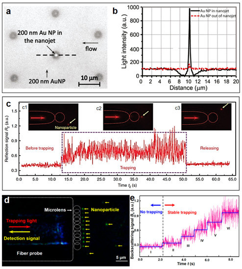 - Li, Y.C.; Xin, H.B.; Lei, H.X.; Liu, L.L.; Li, Y.Z.; Zhang, Y.; Li, B.J. Manipulation and detection of single nanoparticles and biomolecules by a photonic nanojet. Light Sci. Appl. 2016, 5, e16176. [Google Scholar] [CrossRef] [PubMed]