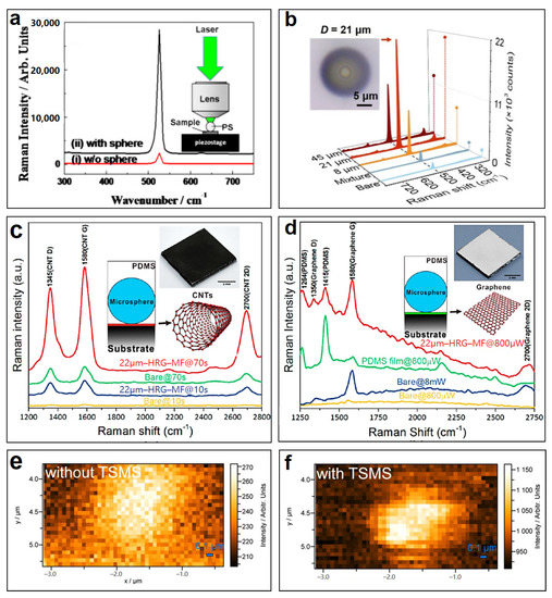 - Arya, A.; Laha, R.; Das, G.M.; Dantham, V.R. Enhancement of Raman scattering signal using photonic nanojet of portable and reusable single microstructures. J. Raman Spectrosc. 2018, 49, 897–902. [Google Scholar] [CrossRef]