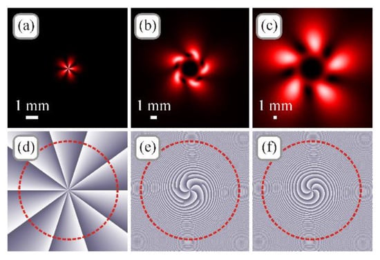 - Soskin, M.S.; Gorshkov, V.N.; Vasnetsov, M.V.; Malos, J.T.; Heckenberg, N.R. Topological charge and angular momentum of light beams carrying optical vortices. Phys. Rev. A 1997, 56, 4064. [Google Scholar] [CrossRef] [Green Version]