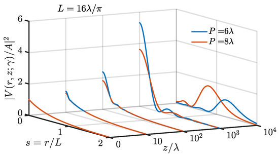 Although in general the integral in Equation (24) cannot be given a closed form, it shows that the shape of the propagated field depends only on two real parameters, namely, the Fresnel number and the ratio between and . As an example, Figure 1 shows the intensity calculated by means of numerical evaluation of Equation (24) at several planes for two different values of the grating periodicity P and a fixed value of the attenuation length L.