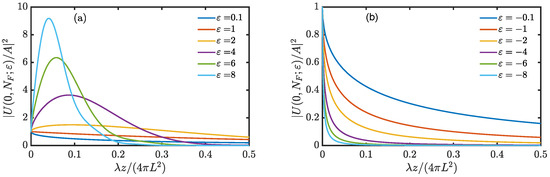 Plots of the axial intensity are shown in Figure 2a (for positive ) and Figure 2b (for negative ) as a function of the normalized coordinate