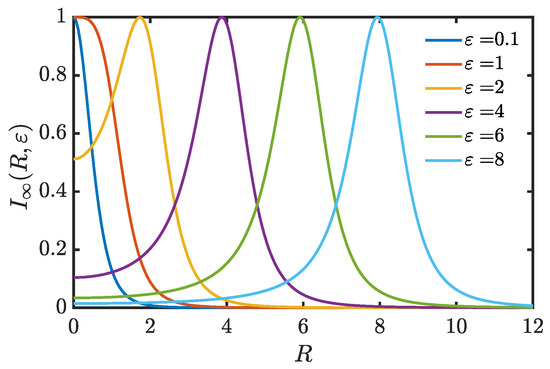 which corresponds to Equation (10) with different symbols. Equation (30) is fairly simple. At first it could even seem a trivial monotonically decreasing function of R. Actually, since is a complex function, its behavior is far richer than that. We begin by examining the intensity, which, up to a constant, is given by . We then find