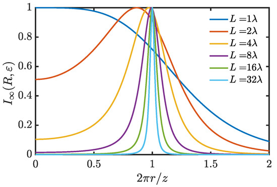 It is seen that on increasing L, i.e., the grating extent, the curves become slimmer and slimmer. We could think that when L tends to infinity the curve of the far-zone field tends to an (annular) Dirac delta function (use of half-integer order delta functions has been suggested in [35]). A moment’s thought however reveals that this cannot be true. An annular delta in the far-field in fact corresponds in the near-field to a Bessel function of zero order [45] and not to an exponential function as in Equation (7).