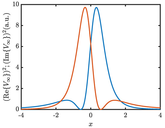 Figure 5 shows the squares of the real and imaginary parts of separately. It is seen that the two functions are symmetrical with respect to the vertical axis. It will be also noted that (provided it is much greater than 1) only determines a proportionality factor, so that the shapes of the curves of Figure 5 do not depend on . It is to be stressed though that their width is to be compared with their mean abscissa, which equals . Hence the two curves become more and more narrow with respect to their mean abscissa when increases.