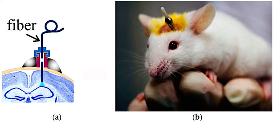 Image of the intracranial location of the fibre optic neural system after implantation: (a) schematic representation, (b) in vivo image on an experimental animal.