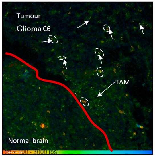 Thus, laser fluorescence methods and devices with picosecond temporal resolution seem to be the most promising for intravital video fluorescence monitoring of biotissues when performing this kind of laser delivery [12,13,14]. In addition to the analysis of coenzyme fluorescence signal inherent to biotissues, molecules and nanoparticles with fluorescent properties, photocytotoxic effect and selective accumulation by various cellular structures and tumour tissues in comparison with surrounding tissues are also of interest [15,16,17,18]. This approach significantly increases the diagnostic informative value of tumour tissue composition by recognising cancer cells and tumour associated macrophages/microglia (TAM) [19].
