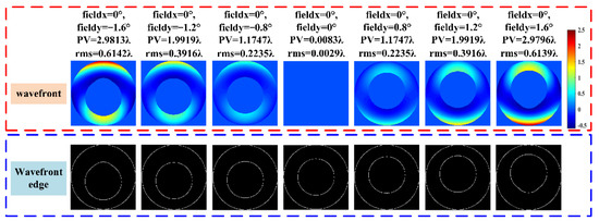 In Figure 1, wavefront maps corresponding to different fields of view between −1.6° and 1.6° are shown. The wavefront maps show that the image quality in the on-axis field of view is good with 0.0029λ (λ = 0.55 μm) wavefront RMS. However, image qualities in other fields of view become worse, especially the images in the edge fields of view. In this paper, the aberrations are corrected using the deformable mirror. The figure indicates that the obscuration centers of the wavefront maps change with the difference of fields of view. To measure the offsets of obscuration accurately, edge check and circle fitting are implemented. The results are shown in Table 1.