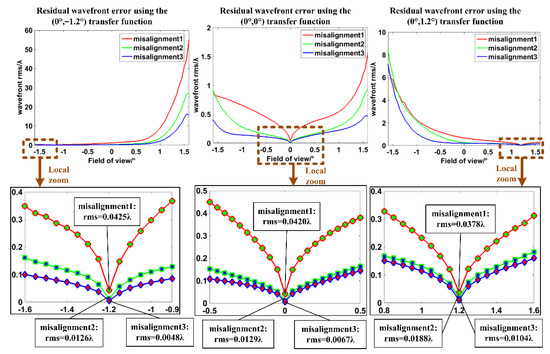 Figure 3 shows the aberration corrected results using the transfer functions corresponding to each field of view in the condition of three kinds of misalignments. That means, for aberrations correction in the field (0°, −1.6°), the transfer function of the deformable mirror is calculated according to the exit pupil in the field (0°, −1.6°), and for aberrations correction in the field (0°, 1.6°), the transfer function of the deformable mirror is calculated according to the exit pupil in the field (0°, 1.6°). In this case, the residual wavefront errors corresponding to different fields of view for three kinds of misalignments are less than 0.05λ, indicating that the aberrations are well compensated when the right transfer functions matching with the fields of view are used. As a result, the transfer functions of the deformable mirror should be employed according to different fields of view.
