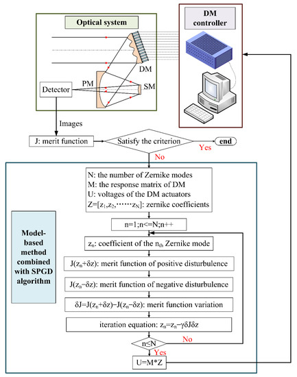 The paper is organized as follows: in Section 2, the principle of the model-based method combined with the SPGD algorithm is introduced, and the transfer functions of the deformable mirror corresponding to different fields of view are analyzed; in Section 3, an experiment using the model-based SPGD algorithm with a Cassegrain telescope and a 357-element deformable mirror is described; and in Section 4, the conclusions are given.