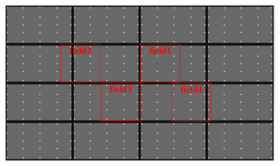 To match the resolution of the optical system, a splicing screen with sixteen computer monitors arranged in a 4 × 4 pattern is employed. The resolution of each computer monitor is 3840 pixels × 2160 pixels, and the size of each pixel is 0.15 mm, satisfying the resolution demands of the optical system and the detection system. The point sources are simulated using monitors with 4 K resolution positioned 25 m away from the optical system. Because the brightness of the monitors is not enough, the images obtained by the detector are badly affected by noise. For this reason, strehl ratio is used as the merit function. In the experiments, four targets with aberrations are corrected. The target distribution is shown in Figure 6.