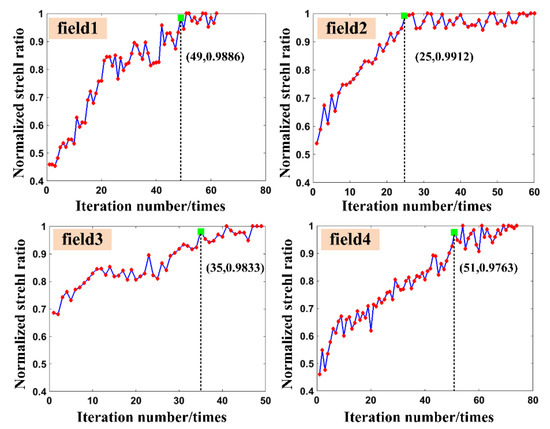 In this paper, the normalized strehl ratio is employed as the merit function to decrease the effect of the noise. For different fields of view, the convergence curves are shown in Figure 7.
