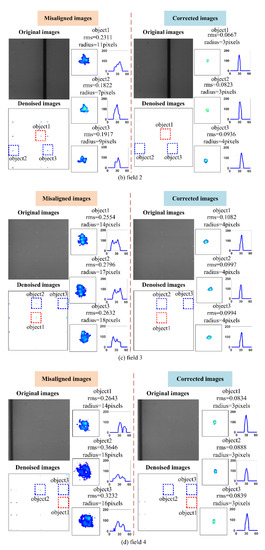 Misaligned and corrected images of (a) field 1, (b) field 2, (c) field 3, (d) and field 4.