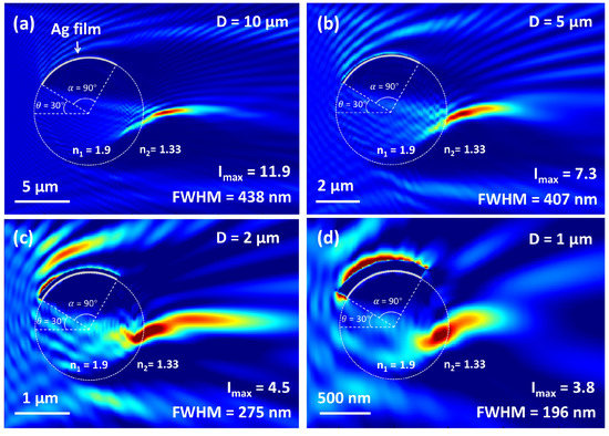 - Yang, H.; Trouillon, R.; Huszka, G.; Gijs, M.A.M. Super-resolution imaging of a dielectric microsphere is governed by the waist of its photonic nanojet. Nano Lett. 2016, 16, 4862–4870. [Google Scholar] [CrossRef]